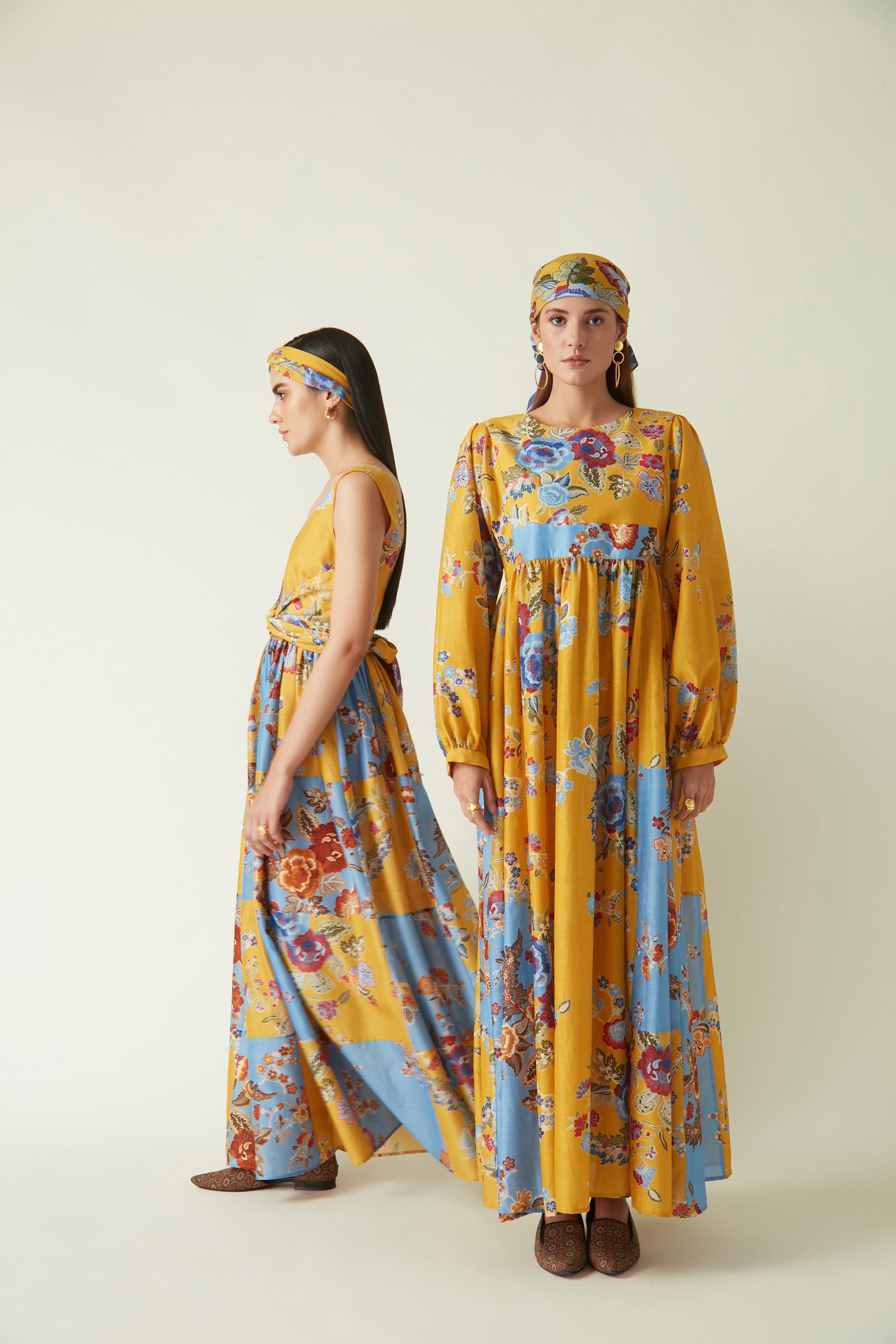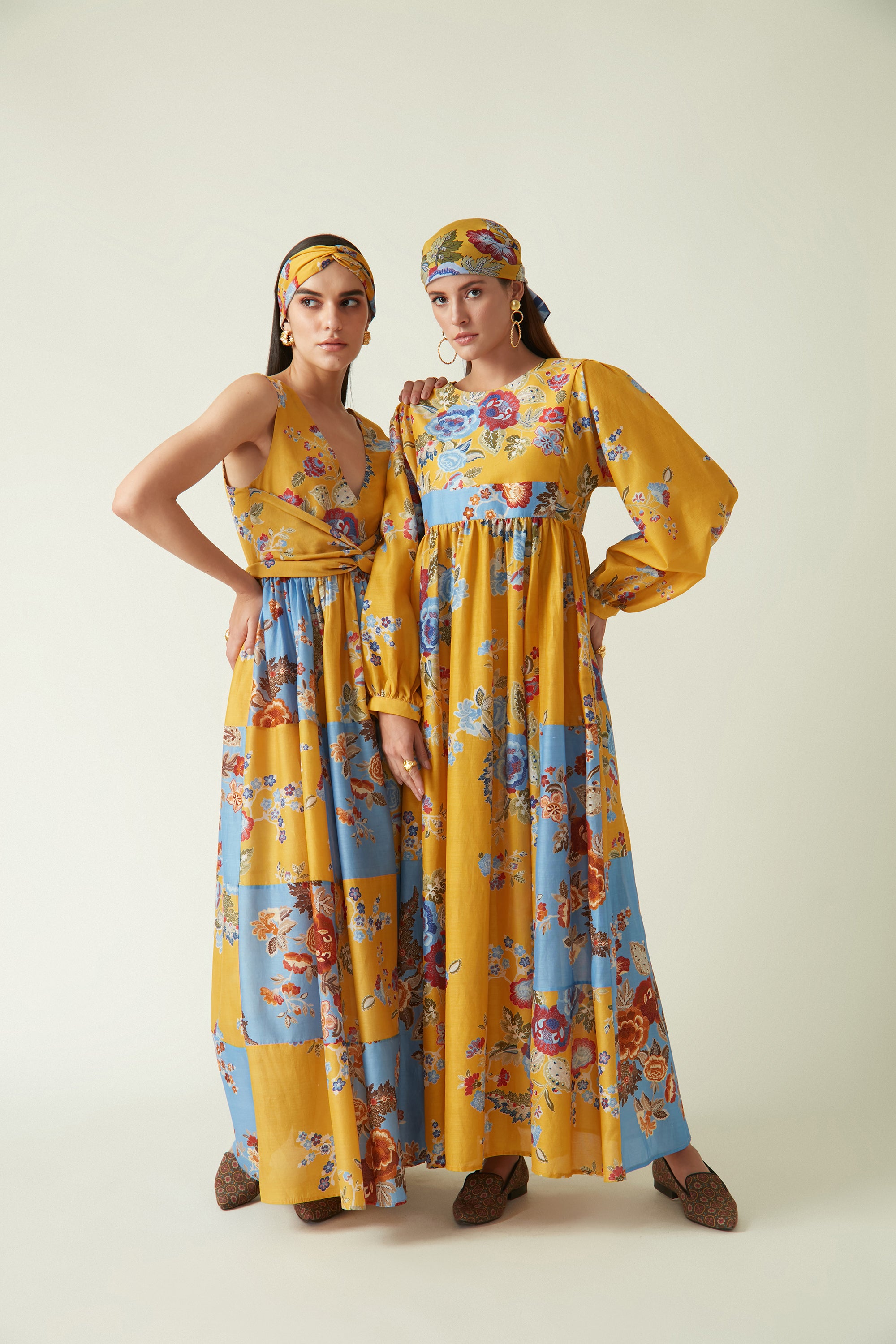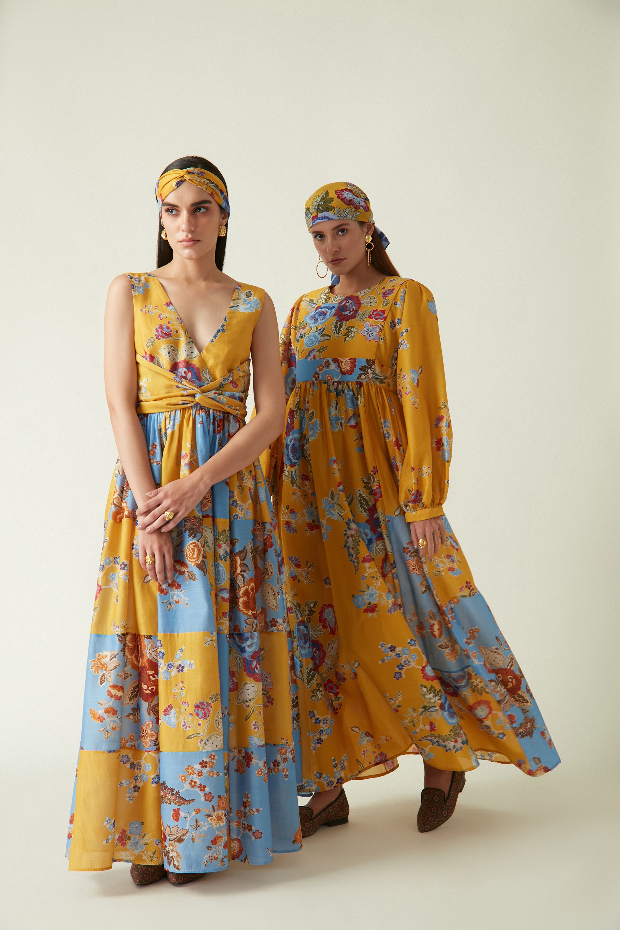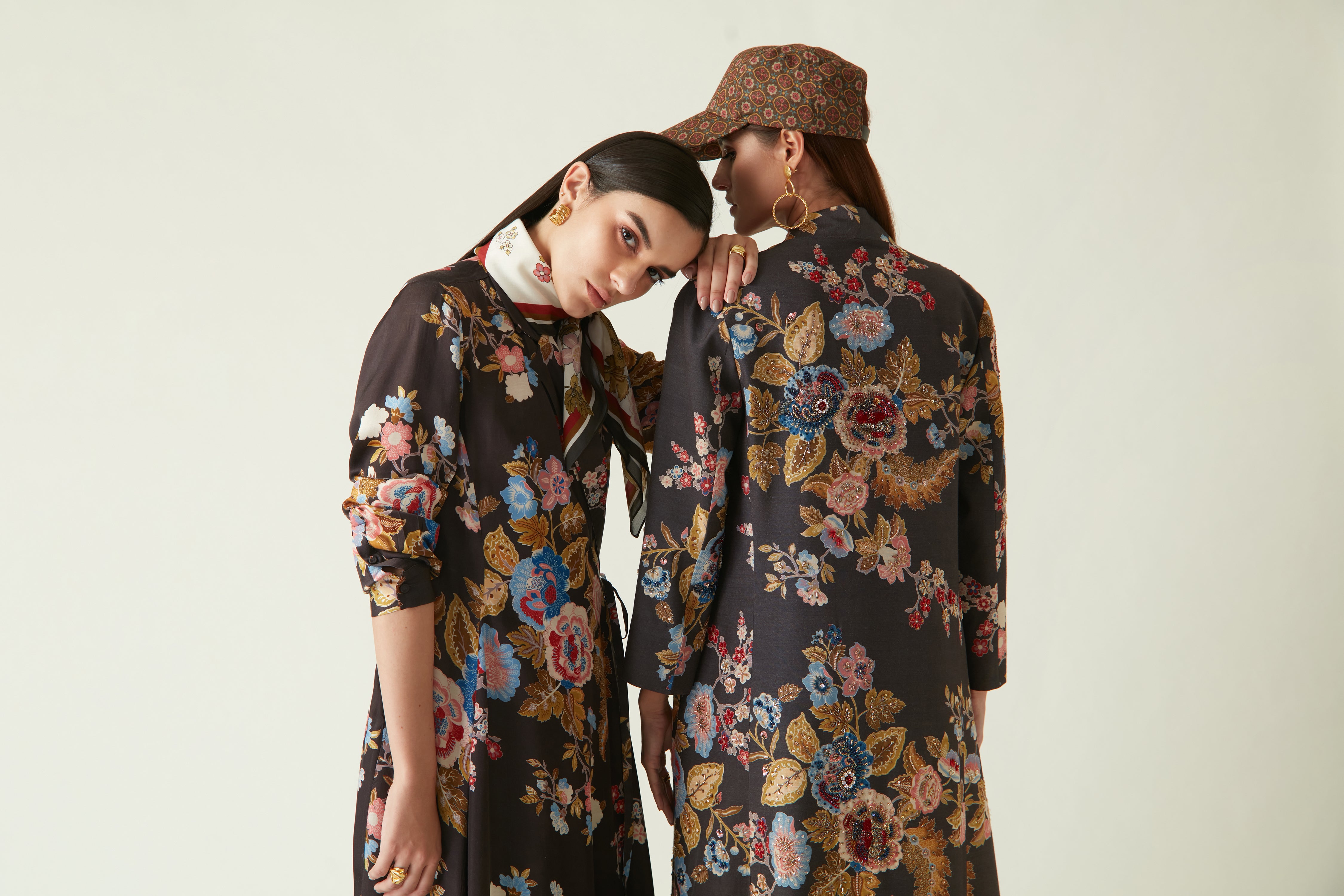 This collaborative range experiments with satins, muslins, mulmul, and silk blends to create a collection replete with fluidity as well as structure. The fabric takes printing and colour beautifully and has a slight sheen and glazed feel which resonates with chintz. The colour palette ranges from indigos, browns, rust, to burgundy, brick and gold. Bold prints, large floral patterns exhibit an exuberance which is hard to contain. This is clearly a return to maximalism, reminiscent of the good old days.