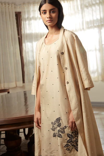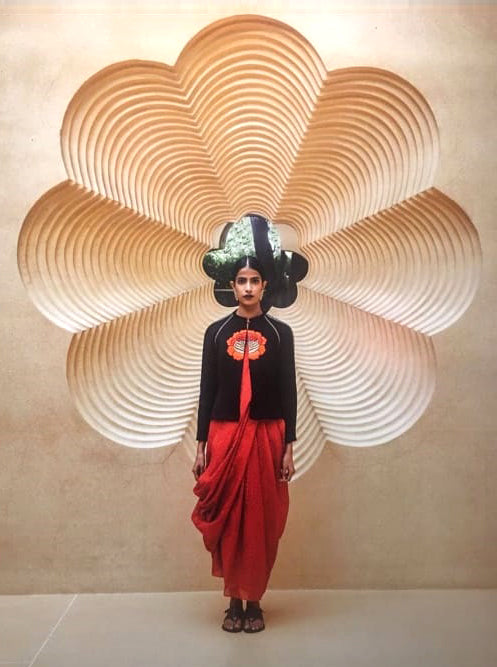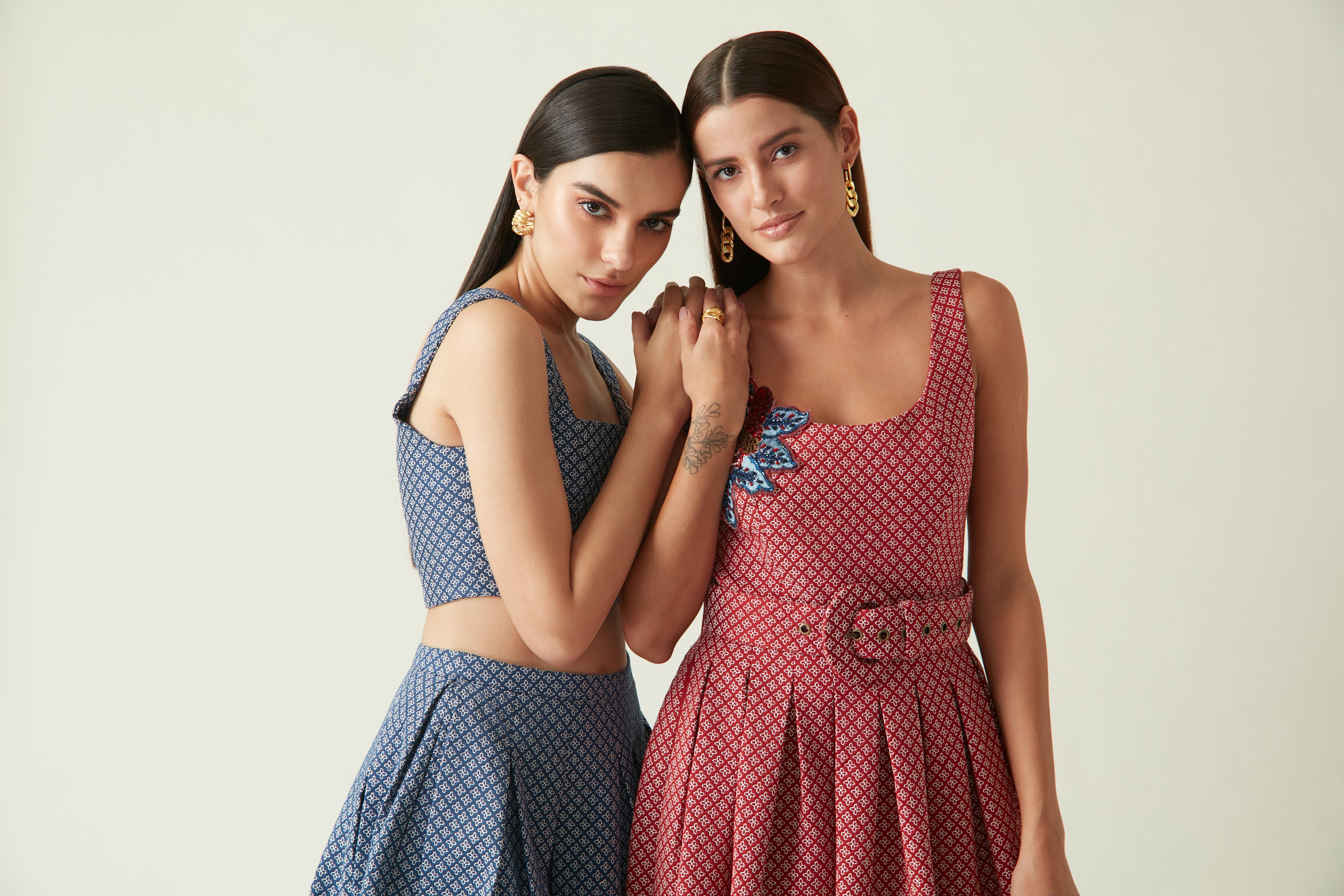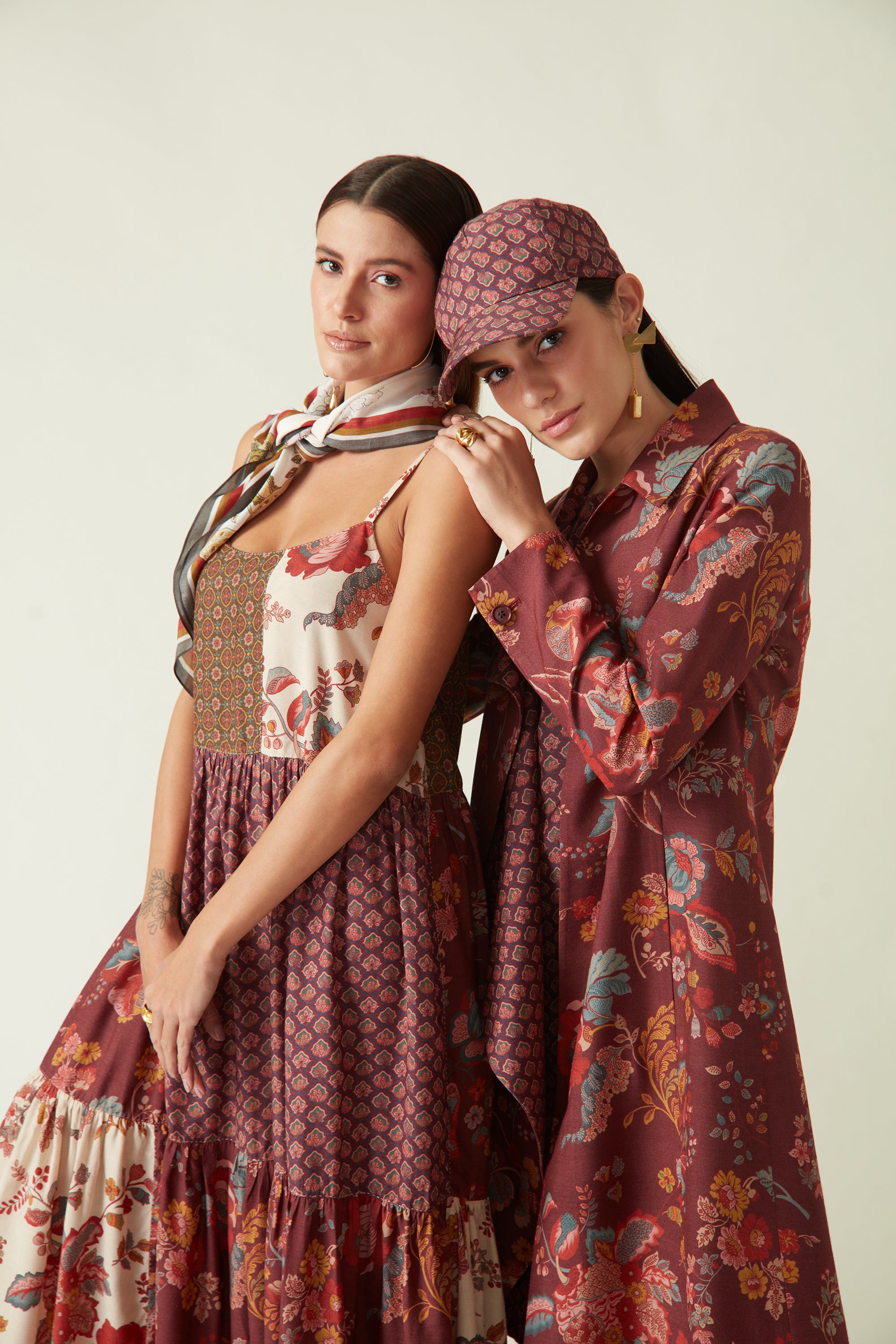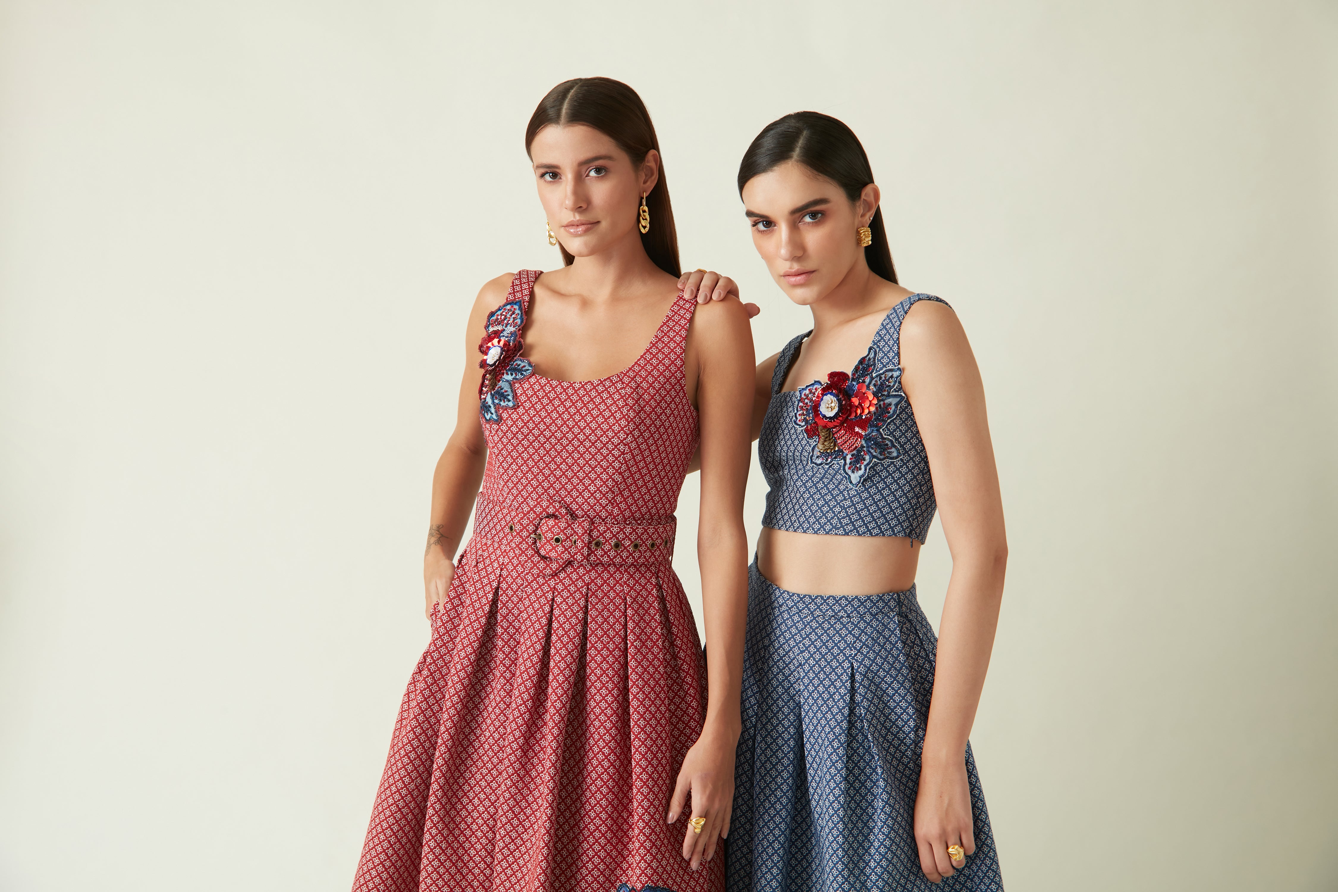 This collaborative range experiments with satins, muslins, mulmul, and silk blends to create a collection replete with fluidity as well as structure. The fabric takes printing and colour beautifully and has a slight sheen and glazed feel which resonates with chintz. The colour palette ranges from indigos, browns, rust, to burgundy, brick and gold. Bold prints, large floral patterns exhibit an exuberance which is hard to contain. This is clearly a return to maximalism, reminiscent of the good old days.