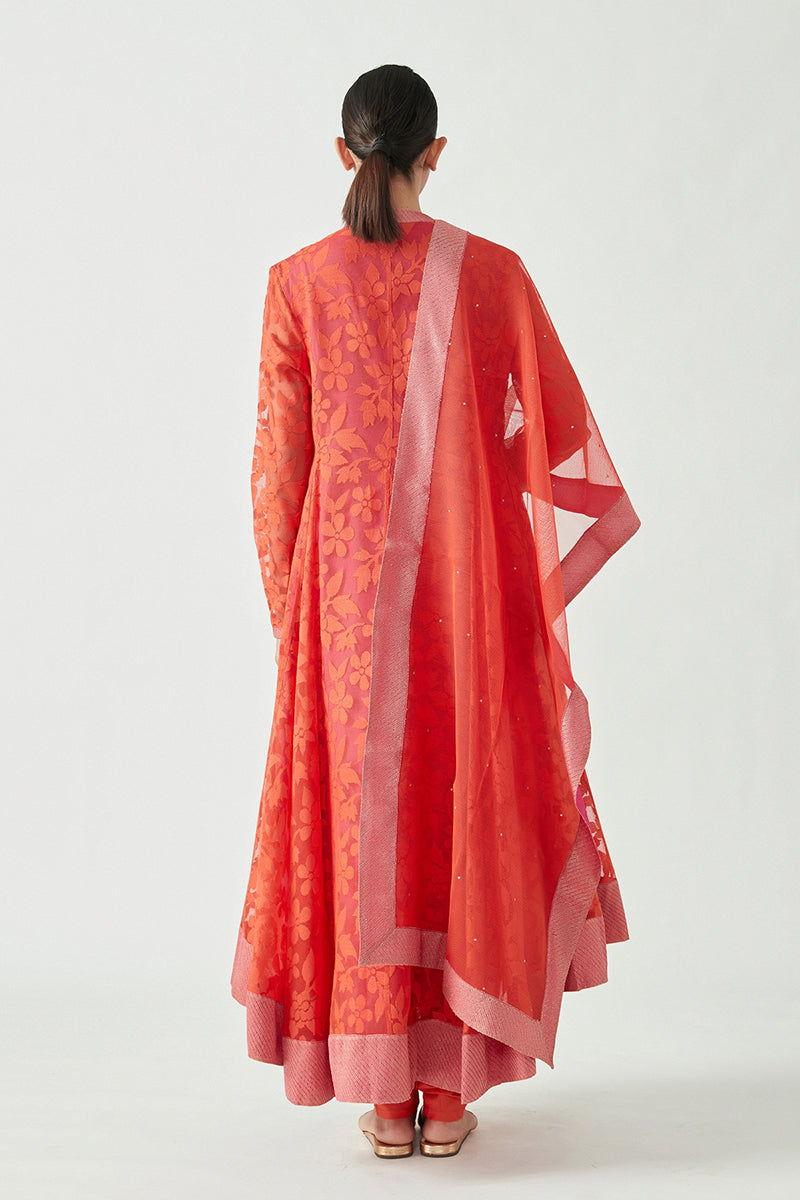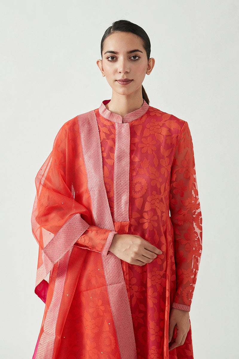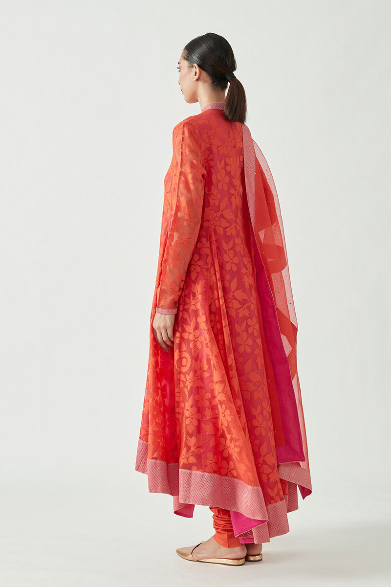 Box pleat kurta with asymmetric hemline, featuring an attached lining for comfort. Paired with churidar and a sheer dupatta with contrast borders.