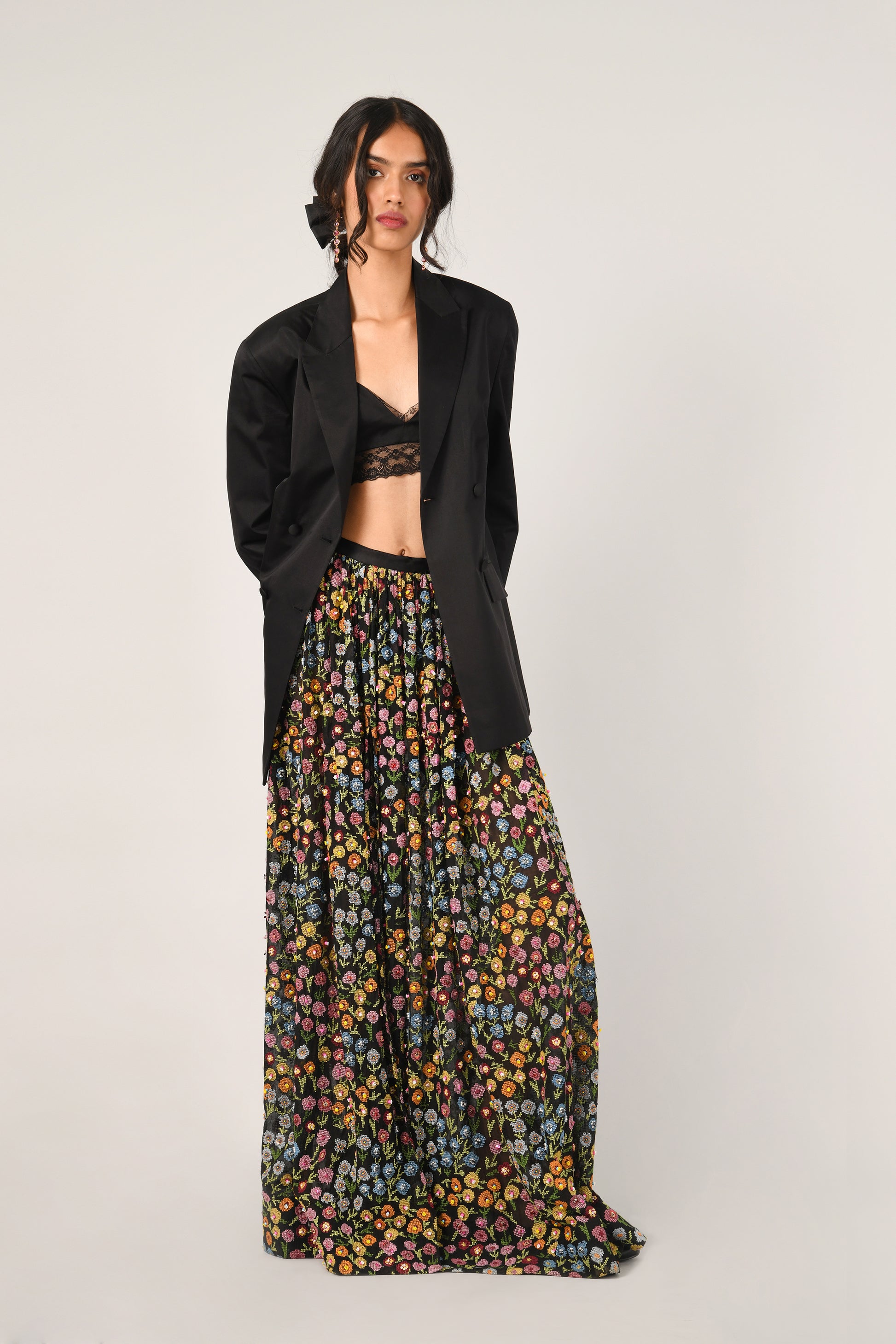 Full-length skirt in cotton silk, detailed with floral embroidery and a front slit. A versatile piece that blends structure with feminine ease