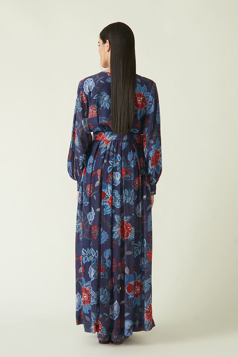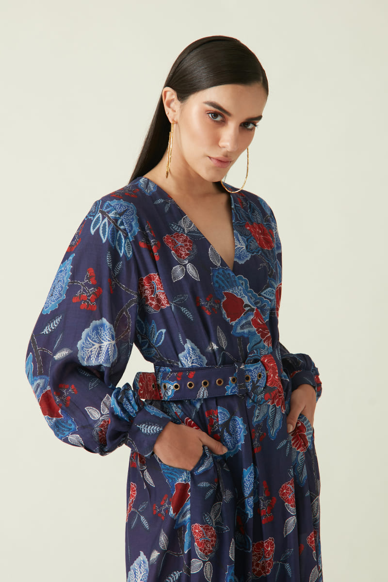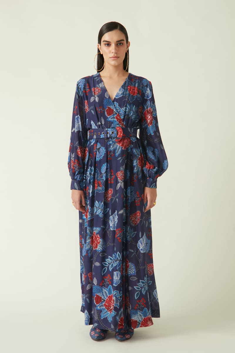 V neck all over printed long dress, falling gracefully from waistline, also have side pocket and breezy sleeves. Teamed with an adjustable buckle belt.