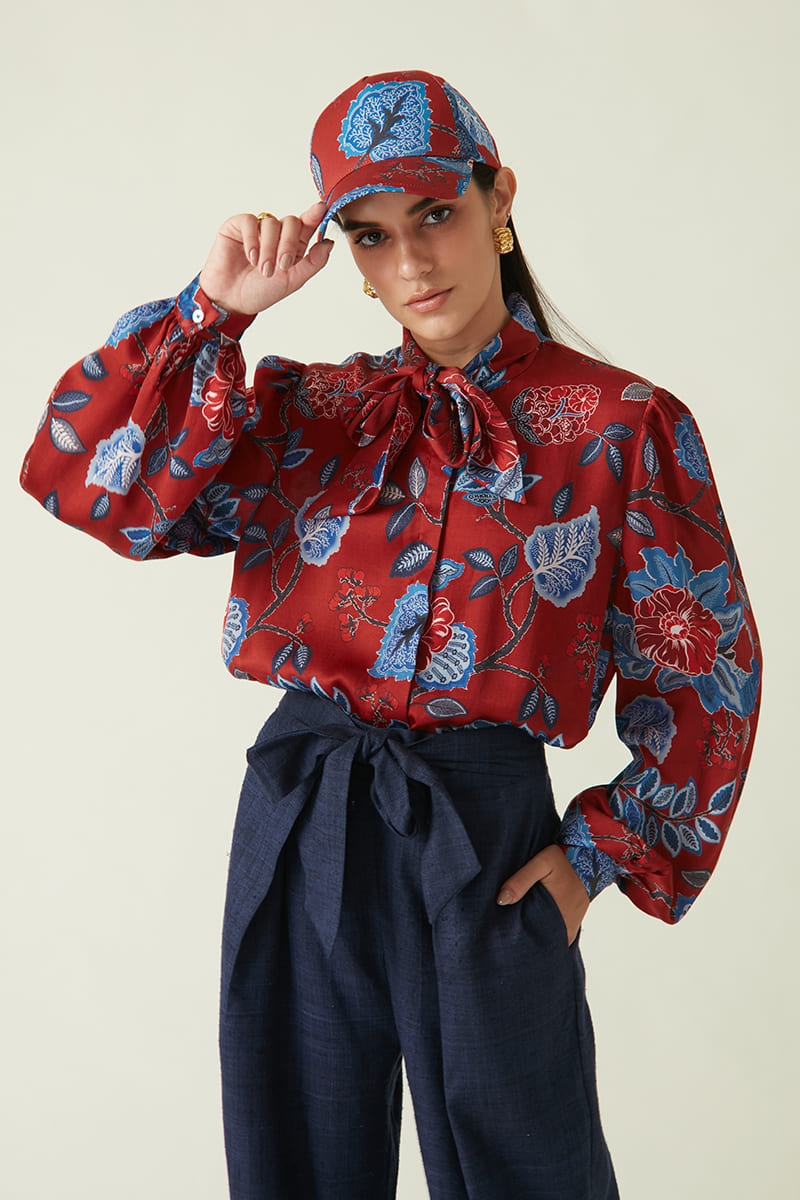 Printed baseball cap made of a lightweight cotton satin with adjustable tab at the back.